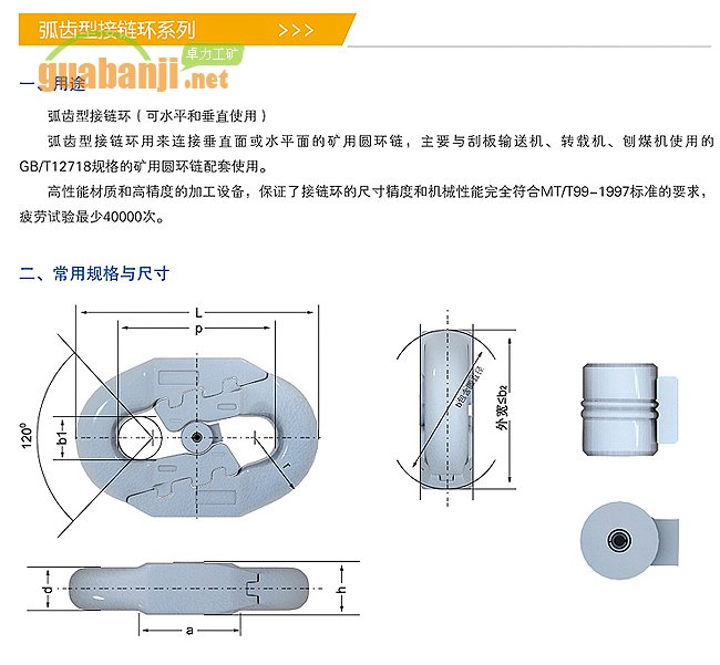 弧齒型接鏈環(huán)用來(lái)鏈接垂直面或水平面的礦用圓環(huán)鏈,主要與刮板輸送機(jī)、轉(zhuǎn)載機(jī)、跑煤機(jī)使用的GB/T12718規(guī)格的礦用圓環(huán)鏈配套使用。
