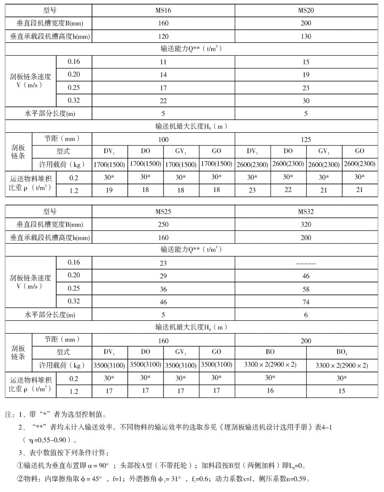 (一)MS型埋刮板輸送機(jī)技術(shù)性能表