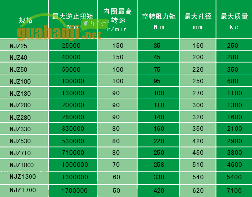 例如:代號NJZ 330-S-280,表示NJZ型接觸式逆止器,額定逆止力矩為330000 N.m,內(nèi)圈轉(zhuǎn)向順時針,安裝孔直徑280mm。